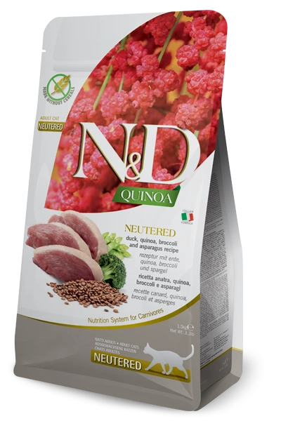 N&D Quinoa feline de pato y brocoli es el nuevo pienso seco completo ideal para gatos de todas las edades, razas y tamaños.